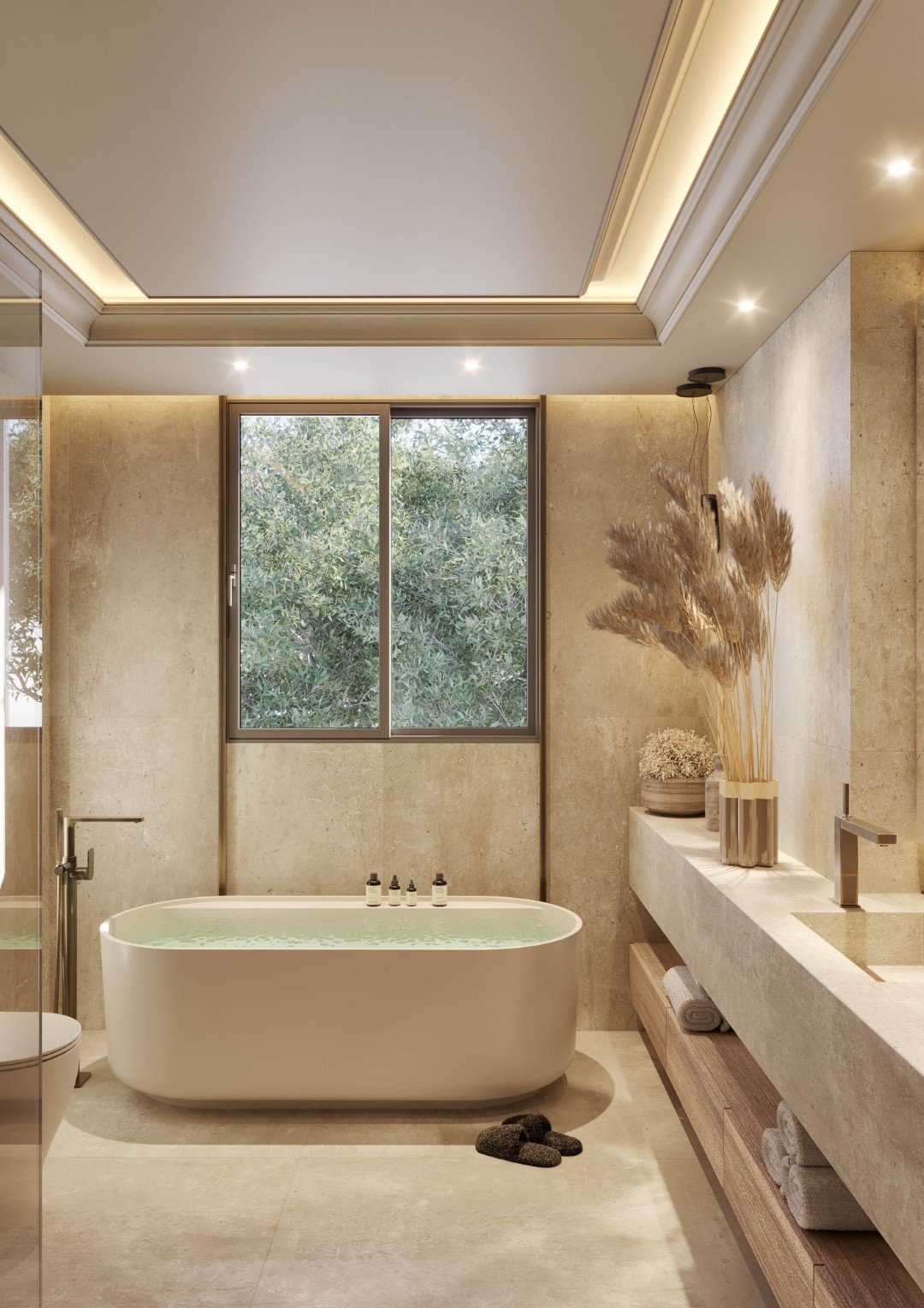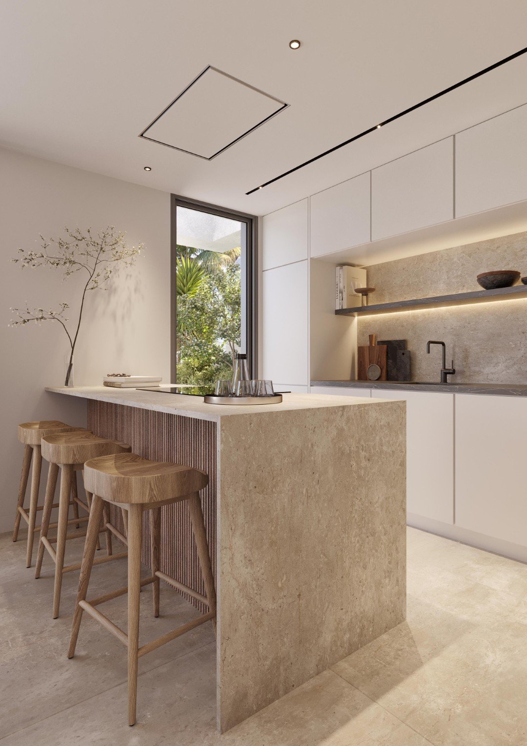 The architectural vision is defined by light, texture, and flow. Each apartment features a neutral palette of natural stone and wood, creating serene interiors that celebrate the surrounding landscape. Spaces are designed with purposeful elegance, allowing air and daylight to move freely throughout.