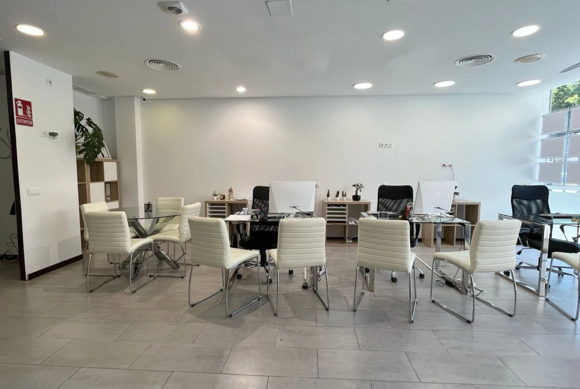 The property is distributed over two levels and offers an approximate built area of 376 m², with the actual usable space being slightly larger. At street level, the premises features two independent entrances, currently arranged as two separate commercial units. These areas are divided by a lightweight partition wall while forming part of a single title deed, allowing the space to be easily adapted to different business needs.